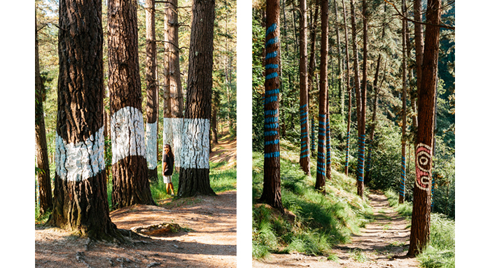 Continuamos la ruta y nos desviamos por el interior a un lugar muy especial al que no habíamos vuelto desde la infancia, el bosque de Oma, obra del pintor y escultor Agustín Ibarrola. Es impresionante perderse entre los árboles e intuir cómo se van formando composiciones cada vez más complejas al unir en perspectiva las pinturas.